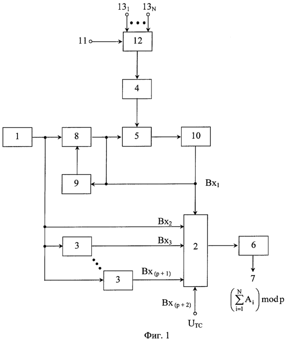 Устройство для сложения N чисел по модулю р, содержащее дешифратор, шифратор, управляемый фазовращатель, генератор гармонического сигнала, (р-1) фазовращателей на фиксированные значения фазы и измеритель фазы гармонического сигнала, причем выход генератора гармонического сигнала соединен со вторым входом измерителя фазы гармонического сигнала, вход которого соединен с выходом генератора гармонического сигнала через фазовращатель на фиксированное значение фазы, равное , при этом (р+2)-ой вход измерителя фазы гармонического сигнала является тактовым входом устройства, выход дешифратора подключен ко второму входу управляемого фазовращателя, выход измерителя фазы гармонического сигнала соединен с входом шифратора, выход которого является выходом устройства, отличающееся тем, что в него введены мультиплексор, коммутатор, амплитудный детектор и усилитель гармонического сигнала, причем выход генератора гармонического сигнала соединен со входом коммутатора, управляющий вход которого соединен с выходом амплитудного детектора, а выход – со входом амплитудного детектора, с первым входом измерителя фазы гармонического сигнала и с первым входом управляемого фазовращателя, выход которого соединен с входом усилителя гармонического сигнала, выход усилителя гармонического сигнала соединен с первым входом измерителя фазы гармонического сигнала и с входом амплитудного детектора, управляющий вход устройства соединен с адресным входом мультиплексора, выход которого соединен со входом дешифратора, а информационные входы мультиплексора являются входами устройства.