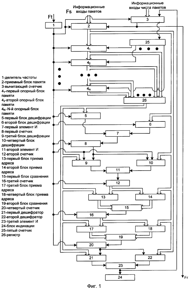 Вход делителя частоты 1 является тактовым входом устройства. Информационный вход входного блока памяти 2 является информационным входом пакетов устройства. Тактовый вход входного блока памяти 2 подключен к выходу делителя частоты 1 и тактовому входу вычитающего счетчика 3, информационный вход числа пакетов которого является информационным входом числа пакетов устройства. Информационный выход входного блока памяти 2 подключен к информационным входам первого опорного блока памяти 41, второго блока дешифрации 6, четвертого блока дешифрации 10, второго дешифратора 22 и вторым информационным входам второго блока приема адреса 14 и четвертого блока приема адреса 18. Тактовые входы первого опорного блока памяти 41, второго опорного блока памяти 42, i-го, где i=1, 2, …, N опорного блока памяти 4N, первого блока дешифрации 5, второго блока дешифрации 6, первого счетчика 8, третьего блока дешифрации 9, четвертого блока дешифрации 10, второго 12, третьего 16 и четвертого 20 счетчиков объединены и подключены к тактовому выходу делителя частоты 1. Управляющий выход первого блока дешифрации 5 подключен к первому управляющему входу первого элемента «И» 7, второй управляющий вход которого подключен к выходу второго блока дешифрации 6. Выход первого элемента «И» 7 подключен к управляющему входу первого счетчика 8, выход которого подключен к управляющему входу третьего блока дешифрации 9 и управляющему входу четвертого блока дешифрации 10. Выход четвертого блока дешифрации 10 подключен ко второму управляющему входу второго элемента «И» 11, первый управляющий вход которого подключен к выходу третьего блока дешифрации 9. Выход второго элемента «И» 11 подключен к управляющему входу второго счетчика 12, выход которого подключен к второму информационному входу первого блока приема адреса 13 и первому информационному входу второго блока приема адреса 14. Первый и второй информационные входы первого блока сравнения 15 подключены к выходам соответственно первого 13 и второго 14 блоков приема адреса. Выход первого блока сравнения 15 подключен к управляющему входу третьего счетчика 16, информационный выход которого подключен к второму информационному входу третьего блока приема адреса 17 и первому информационному входу четвертого блока приема адреса 18. Первый и второй информационные входы второго блока сравнения 19 подключены к информационным выходам соответственно третьего 17 и четвертого 18 блоков приема адреса. Выход второго блока сравнения 19 подключен к управляющему входу четвертого счетчика 20, управляющий выход которого подключен к управляющим входам первого 21 и второго 22 дешифраторов. Первый и второй управляющие входы третьего элемента «И» 23 подключены к выходам соответственно первого 21 и второго 22 дешифраторов. Выход третьего элемента «И» 23 подключен к управляющим входам блока индикации 24 и вычитающего счетчика 3, первый управляющий выход которого подключен к управляющему входу приемного блока памяти 2 и является управляющим выходом устройства. Информационный выход первого опорного блока памяти 41 подключен к информационному входу i-го, где i=1, 2, …, N опорного блока памяти 4N и j-му, где j=1, 2, 3, … N информационному входу регистра 26, информационный выход регистра 26 подключен к информационным входам первого блока дешифрации 5, третьего блока дешифрации 9, первого де