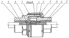 Корпуса штекерной 1 и гнездовой 2 секций соединяются резьбовой стягивающей втулкой 6, которая предохранена от самоотвинчивания контргайкой 7. Поступательное перемещение стягивающей втулки 6 вдоль оси соединителя ограничено с одной стороны выступом на корпусе гнездовой секции 2, а с другой – стопорным кольцом 8.