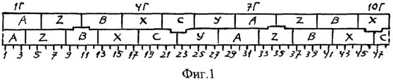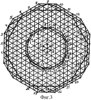 На фиг.1 показана развертка пазовых слоев предлагаемой обмотки при 2р=10, z=144 с номерами 1…144 (для z’=z/3=48 пазов) и номерами катушечных групп от 1Г до 30Г (размечены группы первой фазы 1Г+3(с)Г=1Г, 4Г, 7Г,…), чередованиями фазных зон в последовательности A-Z-B-X-C-Y; на фиг.2 показаны диаграммы сдвига осей нечетных групп первой фазы относительно оси симметрии 19Г для полюсности р=5 основной =l (наружная) и p = p=1 низшей =1/5 (центральная) гармонических: на фиг.3 построены по треугольной сетке многоугольники МДС обмотки фиг.1 при х=0 (внутренняя), х=0,5 (наружная). Такая m’=6-зонная обмотка по фиг.1 соединяется обычным образом при встречном включении в фазах четных групп относительно нечетных с их началами из начал групп 1Г, 11Г, 21Г для фаз I, II, III и фазы могут сопрягаться звездой или треугольником.
