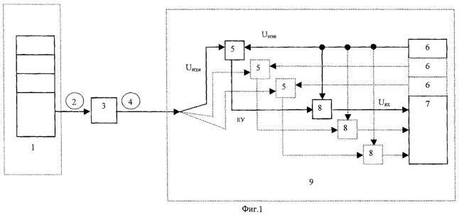 Сигнал от ведущего ПЭГ 1 передается по системе передачи СЦИ/ПЦИ к ведомому ПЭГ 9. Например, в виде тактовых импульсов первичной цифровой группы. На выходе оборудования СЦИ/ПЦИ 3 сигнал размножается на необходимое количество выходов, и подается на УИ 5, команды которого подаются на УС 8. УС, работая по принципу сравнения фаз Uизм и Uпэи, определяет усредненную ошибку временного интервала. Команды управления проводя корректировку фазы сигнала Uвх с шагом в доли наносекунд не должны изменять усредненное значение частоты ПЭИ 6 более, чем на несколько единиц 10-12. Скорректированный по частоте сигнал Uвх с УС 8 передается на вход ВЗГ 7. Подстройка частоты на величину 2×10-12 может, например, происходить с периодом 100 с и на значение 0,2 нс. Если происходит пропадание сигнала или резкое изменение его фазы система исключает эти данные из процесса измерения.