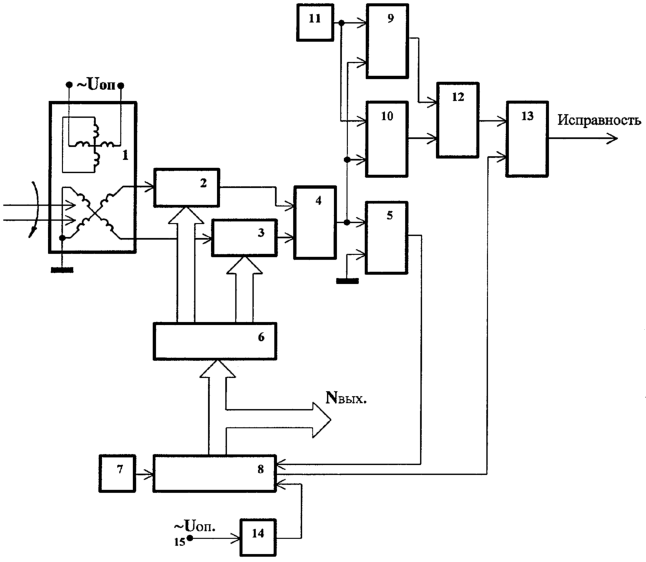 Первый и второй выходы синусно-косинусного датчика угла 1 соединены соответственно с аналоговыми входами первого 2 и второго 3 блоков умножения, выходы первого 2 и второго 3 блоков умножения соединены с входами блока 4 вычитания, выход блока 4 вычитания соединен с первыми входами первого 5 и второго 9 компараторов и вторым входом третьего 10 компаратора, второй вход первого 5 компаратора соединен с шиной нулевого потенциала преобразователя, выход первого 5 компаратора соединен с информационным входом регистра 8 последовательных приближений, выход генератора 7 тактовых импульсов соединен с синхровходом регистра 8 последовательных приближений, вход порогового блока 14 является входом задания переменного опорного напряжения преобразователя, выход порогового блока 14 соединен с входом запуска регистра 8 последовательных приближений, выход “конец преобразования” регистра 8 последовательных приближений соединен с входом записи D-триггера 13, информационные выходы регистра 8 последовательных приближений соединены с входами блока 6 синусно-косинусного преобразования кода и одновременно являются информационными выходами преобразователя, первый и второй выходы блока 6 синусно-косинусного преобразования кода соединены соответственно с цифровыми входами первого 2 и второго 3 блоков умножения, выход источника 11 порогового напряжения соединен с вторым входом второго 9 компаратора и первым входом третьего 10 компаратора, выходы первого 9 и третьего 10 компаратора соединены с входами элемента И 12, выход элемента И 12 соединен с информационным входом D-триггера 13, выход D-триггера 13 является выходом исправности преобразователя.