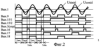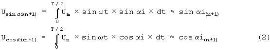 Во втором периоде сигнальных напряжений по сигналу управления, сформированного блоком 9 запуска и остановки интеграторов, первым 15 триггером и вторым 18 элементом И (см. Фиг.2) третий 13 и четвертый 14 интеграторы интегрируют входные напряжения, поступающие с выходов четных (k=n, где n=0, 2, 4…; k – номер синусно-косинусных трансформаторных датчиков 1) синусно-косинусных трансформаторных датчиков 1, в течение первого полупериода сигнальных напряжений, что обеспечивается пороговыми элементами 6 и 7, настроенными попарно на положительные и отрицательные пороговые напряжения, элементом 4И-НЕ 8 и блоком 9 запуска и остановки интеграторов и, тем самым, позволяет исключить ошибку от квадратурной составляющей и высших гармоник, кратных двум. В результате интегрирования на выходах третьего 13 и четвертого 14 интеграторов получаем: