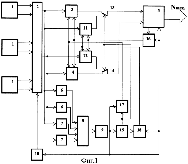 При повороте вала синусно-косинусных трансформаторных датчиков 1 на некоторый угол i напряжения с их выходных обмоток, пропорциональные sin i и cos i, через коммутатор 2, согласно выбранному счетчиком 10 адресу, соответствующему определенному входному параметру, последовательно во времени подключаются к входам первого 3 и третьего 11, и второго 4 и четвертого 12 интеграторов соответственно.