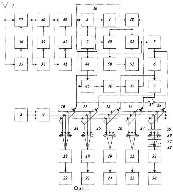 Поставленная задача решается тем, что устройство для распознавания информационных сигналов, содержащее приемную антенну, две диафрагмы, оптический клин, последовательно включенный гетеродин, первый смеситель и первый усилитель промежуточной частоты, последовательно включенные первый, второй и третий умножители фазы на два, а также последовательно установленные на одной оптической оси источник излучения, коллиматор и с первого по пятый модуляторы излучения, управляющие входы со второго по четвертый модуляторов излучения соединены с выходами первого, второго и третьего умножителей фазы на два соответственно, на пути распространения дифрагированных с первого по пятый модуляторами излучения пучков света установлены соответственно с первого по пятый объективы, в фокальной плоскости которых размещены соответственно, с первого по пятый фотоприемники, выходы которых являются соответственно с первого по пятый информационными выходами устройства, при этом первая диафрагма, пятый объектив и вторая диафрагма установлены последовательно на пути распространения дифрагированного пятым модулятором излучения пучка света, а оптический клин предназначен для преобразования координаты максимума светового распределения пятого объектива и размещен в его фокальной плоскости, снабжено двумя узкополосными фильтрами, двумя полосовыми фильтрами, тремя фазоинверторами, четырьмя сумматорами, амплитудным детектором, ключом, перемножителем, двумя фазовращателями на 90°, вторым смесителем и вторым усилителем промежуточной частоты, причем к выходу приемной антенны последовательно подключены первый узкополосный фильтр, первый фазоинвертор, первый сумматор, второй вход которого соединен с выходом приемной антенны, первый полосовой фильтр, второй фазоинвертор, второй сумматор, второй вход которого соединен с выходом первого сумматора, второй полосовой фильтр, третий фазоинвертор, третий сумматор, второй вход которого соединен с выходом второго сумматора, второй смеситель, второй вход которого через первый фазовращатель на 90° соединен с вторым выходом гетеродина, второй усилитель промежуточной частоты, второй фазовращатель на 90°, четвертый сумматор, второй вход которого соединен с выходом первого усилителя промежуточной частоты, перемножитель, второй вход которого соединен с выходом третьего сумматора, второй узкополосный фильтр, амплитудный детектор и ключ, второй вход которого соединен с выходом четвертого сумматора, а выход подключен к первому умножителю фазы на два, управляющий вход первого модулятора излучения соединен с выходом четвертого сумматора, управляющий вход пятого модулятора излучения через выключатель соединен с выходом четвертого сумматора, второй вход первого смесителя соединен с выходом третьего сумматора.