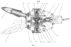 Копир-датчик снабжен щупами в виде активной вилки с наконечниками 5 на валах 6. На корпусе 1 копир-датчика установлена шестерня 7, связанная через вал 8 с гидроприводом 9. Шестерня 7 входит в зацепление с колесом 10 дифференциального механизма (ДМ). При этом сателлиты 11, установленные на осях 12, входят в зацепление с левой 13 и правой 14 выходными шестернями ДМ. Дифференциальный механизм предназначен для сравнения угловых перемещений шестерен 13 и 14, на которые жестко посажены шестерни 15, 16, входящие в зацепление с колесами 17, 18 привода левого и правого наконечников 5 активной вилки. Одновременно левая шестерня 13 ДМ через карданный вал 19 связан с ротором 20, а шестерня 14 – со статором 21 насос-дозатора. При этом трубопроводы 22, 23 насос-дозатора через соединительные устройства 24, 25 связаны соответственно левой 26 и правой 27 торцовыми полостями распределительно-дозирующего устройства.