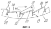 Однако в данном примере выполнения каркасная рама 18 заполнена изогнутыми под углом перфорированными листами 19. Эти перфорированные листы 19 установлены таким образом, что вершины WS образуемых ими уголков образуют множество ступеней, которые примыкают друг к другу без соединительных стыков и образуют собственно решето сепарирующего короба. Выполненные в виде полос перфорированные листы 19 расположены, например, таким образом, что продольные оси их основных корпусов проходят параллельно оси 11 сепарирующего ротора. Расположенные в ряд отверстия в листах выполнены в виде удлиненных отверстий 20, которые захватывают обе полки 22 и 23 и вершину WS уголкового профиля, занимая на одной полке большую площадь, а на другой меньшую площадь. Относительно направления DR движения убранной массы задние концы отверстий 20 образуют прямые кромки 21, проходящие параллельно оси ротора. Как видно на фиг.8 и 9, проходящие в окружном направлении полки 22 примыкают без зазора к смежным направленным радиально вниз полкам 23 таким образом, что кромка 21 каждого листа 19 расположена на уровне свободного или консольного конца полки 22 соседнего листа 19 и образует с ним одну прямую линию. За счет этого, а также за счет того, что удлиненные отверстия 20 захватывают площадь отогнутой вниз полки листа, предотвращается возможность застревания в отверстиях 20 стеблей убранной массы, что вызвало бы значительное нарушение потока массы и нежелательное интенсивное измельчение стебельчатой массы.