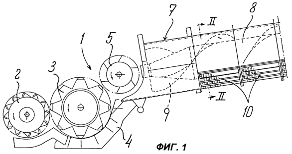 На фиг.1 позицией 1 обозначена передняя часть оборудования зерноуборочного комбайна, содержащего сепарирующее устройство. Оно состоит в основном, например, из питающего барабана 2, молотильного барабана 3 с принадлежащим ему подбарабаньем 4 и подающего барабана 5. За подающим барабаном 5 установлено осевое сепарирующее устройство 7, содержащее корпус 8 ротора, в котором установлен приводной ротор 9 с осью 11 ротора. В нижней части корпус 8 ротора снабжен сепарирующими коробами 10.