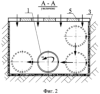 Для нормального протекания процесса удаления навоза вначале включают привод 2 рабочего органа 1, расположенного в поперечном навозном канале 4, а затем – привод рабочего органа в продольном навозном канале 3. Рабочий орган 1, расположенный в продольном навозном канале 3, в начале процесса устанавливают в нижнем правом углу канала (см. фиг.2), а затем по мере выгрузки навоза перемещают вдоль днища к левому углу канала. Рабочий орган 1, находящийся в поперечном канале 4, устанавливают так, чтобы поток навоза, подаваемого рабочим органом 1, из продольного навозного канала 3 приходился по оси симметрии канала, а затем перемещают вдоль днища канала.