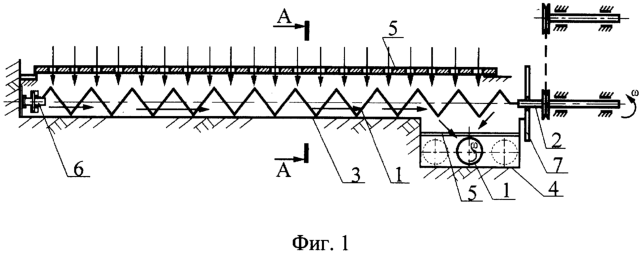 Известно устройство для удаления жидкого и полужидкого навоза, содержащее транспортирующие рабочие органы, размещенные в продольном и поперечном навозных каналах. Стенки навозных каналов выполнены с чередующимися между собой продольными полосами из антифрикционного материала и бетона, установленными вдоль навозных каналов по линиям контакта с рабочим органом. Навозные каналы имеют в поперечном сечении треугольную форму и закрыты сверху решетками. Рабочий орган выполнен в виде гибкого цилиндрического винта. Привод рабочего органа размещают со стороны выгрузки продукта, а вал привода пропущен через брызгоотражательный щиток [1].