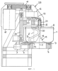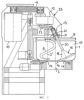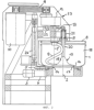Запирающее устройство 15 опирается через подшипник 21 вместе с приводом поворота 22 на головную часть машины 23, на которой также размещены рабочие органы 9 и приводные средства к ним 10, 11, 12, 13. Эта головная часть машины 23 перемещается при помощи подъемного цилиндра 24 вдоль не представленных детально вертикальных направляющих вверх и вниз, а именно: между нижним рабочим положением (фиг.1), в котором запирающее устройство 15 находится в закрытом положении, и верхним положением чистки и обслуживания, в котором запирающее устройство 15 находится поверх верхнего края дежи 1. В этом положении рабочие органы и запирающее устройство 15 полностью доступны для чистки и обслуживания, так как при подъеме головной части машины 23 поднимается также крышка 8 дежи.