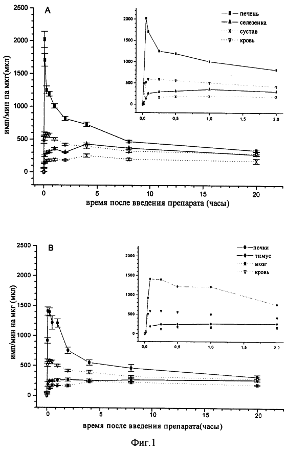 Повышенная эффективность предлагаемой БАД к пище обусловлена комплексным применением хитозансодержащих различных фитосредств, использованием водорастворимых форм хитозана полифракционного состава, высокомолекулярная фракция которого обладает бактериостатическим свойством и обеспечивает пролонгирующее действие фитокомпонентов, а олигомерная фракция при сублингвальном применении быстро всасывается в кровь, попадая в различные органы, и выполняет иммунокоррегирующее действие. Динамика проникновения и выведения олигомеров 3H-хитозана в кровь и различные органы наглядно демонстрируется исследованием на мышах линии С-57/ВС (фиг.1 и 2).