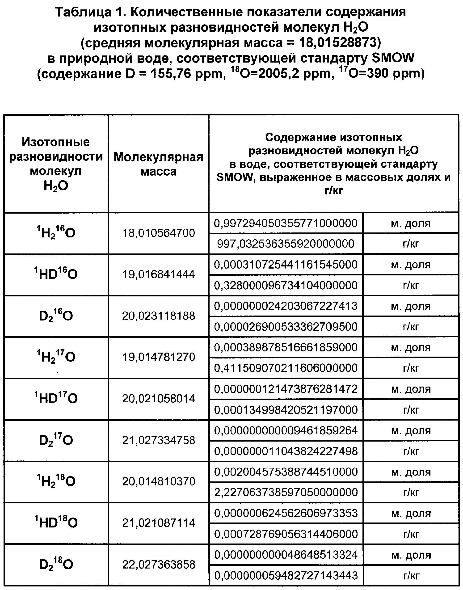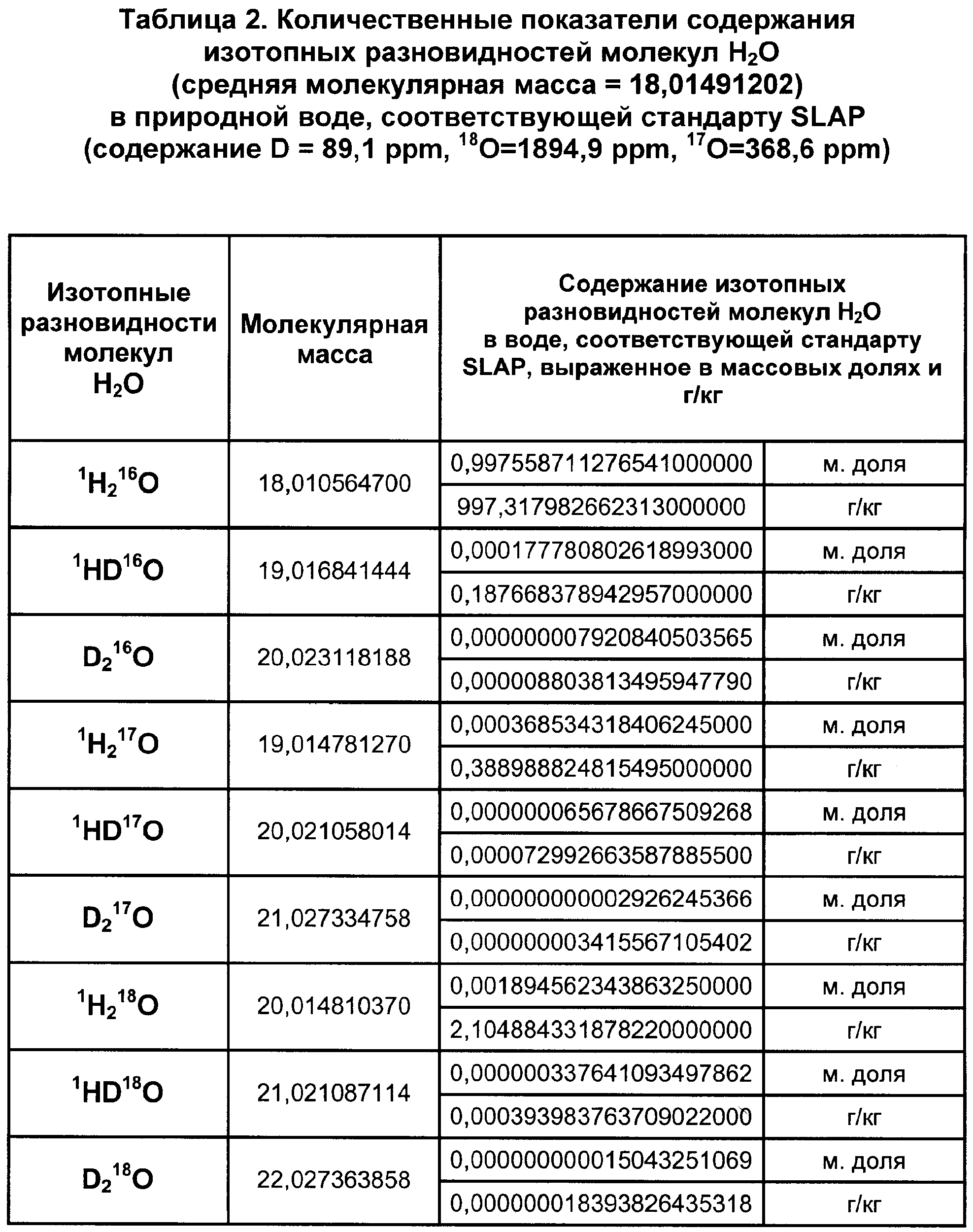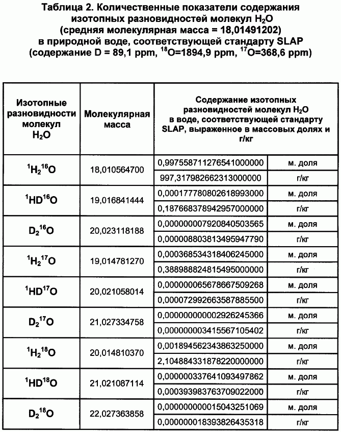 Таким образом, в природных водах в 1000000 молекул Н2О в среднем содержится 997284 молекул 1H2 16O, 311 молекул 1HD16O, 390 молекул 1H2 17O и около 2005 молекул 1H2 18O. Массовая доля и соответствующее ей весовое количество изотопных разновидностей молекул Н2О в природной воде, соответствующей стандарту SMOW, приведено в таблице 1. Аналогичные показатели для природной воды, соответствующей стандарту SLAP, приведены в таблице 2.