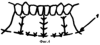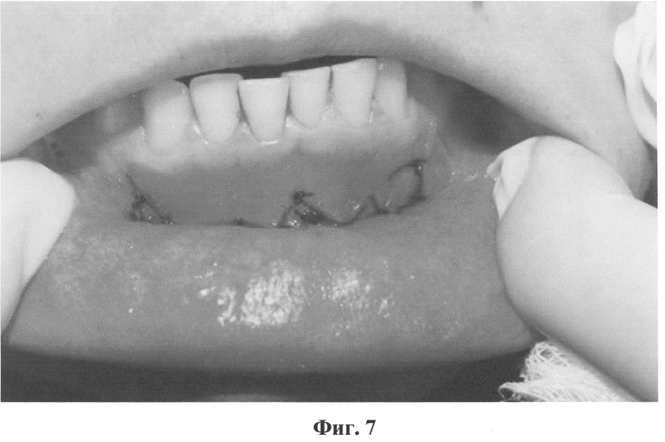 После курса противовоспалительной терапии проведена вестибулопластика на нижней челюсти по предлагаемому способу. На фото (фиг.5) показана полость рта пациентки с мелким преддверием до операции. Под инфильтрационной анестезией сделаны разрезы слизистой оболочки преддверия полости рта в вдоль уздечки нижней губы и слизистых тяжей на всю их длину между 33 и 34, 43 и 44 зубами. Тупо отслоены подслизистые ткани вдоль надкостницы на запланированную глубину преддверия, определено отсутствие тяжей и мышечных волокон (фиг.6). Мобилизованная слизистая оболочка подшита к надкостнице на глубине 12 мм резорбируемым шовным материалом (Dexon), вертикальные разрезы ушиты также с фиксацией к надкостнице на необходимой глубине (фиг.7).