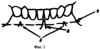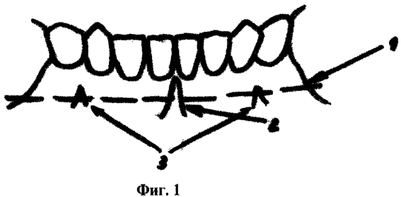 Фиг.1. Полость рта с мелким преддверием до операции (схематическое изображение). Пунктирной линией (1) обозначена глубина преддверия (до операции), (2) – уздечка нижней губы, (3) – естественные слизистые тяжи.