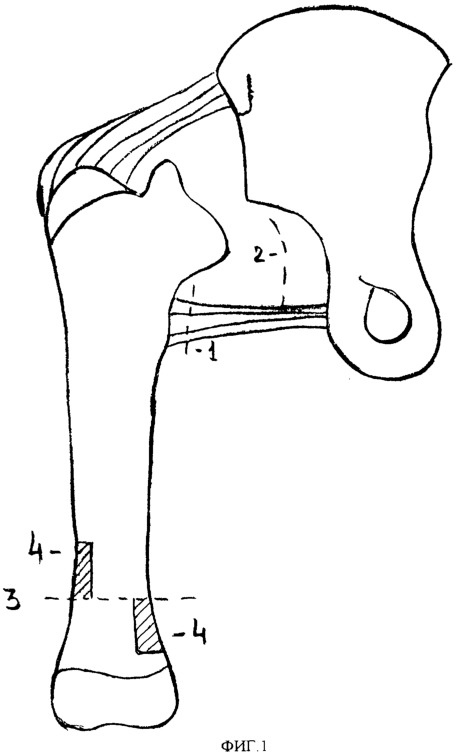 Углообразным разрезом по латеральной поверхности бедра в проекции тазобедренного сустава выделяется проксимальный конец бедренной кости, после рассечения широкой фасции бедра выделяется промежуток между мышцей, напрягающей широкую фасцию бедра, и средней ягодичной мышцей, пересекается сухожилие пояснично-подвздошной мышцы 1 (фиг.1), затем вскрывается капсула тазобедренного сустава 2 (фиг.1), освобождается полость вертлужной впадины от рубцовых тканей. Производится второй разрез по наружной поверхности бедра, выделяется нижняя треть бедренной кости, осуществляется поперечная остеотомия 3 (фиг.1), затем с проксимального фрагмента по латеральной поверхности, а с дистального фрагмента по медиальной поверхности удаляются части кортикальных пластин. Высота резекции кортикальных пластин 4 (фиг.1) равна высоте стояния головки бедра относительно вертлужной впадины, а ширина удаляемой части кортикальных пластин должна обеспечивать возможность вхождения проксимального и дистального фрагментов друг в друга и поворота для установления головки бедра в вертлужную впадину. Фрагменты фиксируются шурупами 5 (фиг.2). Далее производится выделение большого вертела вместе с малой и средней ягодичными мышцами, остеотомия большого вертела с сохранением его зоны роста и частью кортикальной пластины 6 (фиг.2), низведение его на латеральную часть бедренной кости с внедрением кортикальной пластины в сформированное отверстие, фиксация шурупами при отведении бедра 7 (фиг.3). Операционная рана ушивается наглухо. Сроком на 4 недели накладывается полуторная гипсовая повязка с последующим проведением реабилитационных мероприятий.