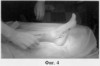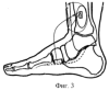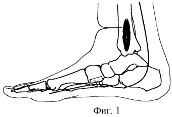 2. На фиг.3 ликвидацию мягкотканого и костного дефекта осуществляют кожно-костным медиальным подошвенным лоскутом, причем кровоснабжаемый костный трансплантат укладывают между мышцами коротких сгибателей пальцев в костный дефект большеберцовой кости и фиксируют спицей Киршнера.