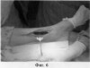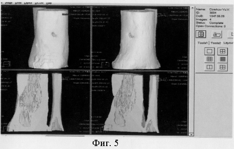 Клинический пример. Больной Ж. поступил в клинику военно-полевой хирургии ТВМедИ в 12.02.2004 года с диагнозом: “Хронический посттравматический остеомиелит нижней трети левой большеберцовой кости, свищевая форма (фиг.4). Из анамнеза известно, что в результате автодорожной травмы (1964 год) получил открытый перелом левой большеберцовой кости, который осложнился развитием хронического остеомиелита левой голени. По поводу вышеназванного заболевания в разные годы 9 раз выполнились оперативные вмешательства: вскрытия параоссальных флегмон; декомпрессивные остеотрепанации; удаление секвестров. При поступлении на КТ-граммах (фиг.5) определяется в нижней трети левой большеберцовой кости очаг деструкции 10×6×4 см. Выполнена операция согласно предлагаемому способу. В результате секвестрнекрэктомии очага остеодеструкции образовалась костная полость размерами 12×6×5, см. (фиг.6). Следующим этапом взят кожно-костный медиальный подошвенный лоскут с включением в него кровоснабжаемого костного фрагмента медиальной клиновидной кости, размерами 2×1×1, см. (фиг.7). Кровоснабжаемый лоскут на проксимальной сосудистой ножке повернут на 180° и уложен в реципиентное ложе. Причем костный трансплантат помещен в костный дефект болшеберцовой кости и фиксирован спицей. Мягкотканый компонент лоскута подшит узловыми швами к краям раны голени, образовавшейся после иссечения краев мягкотканого дефекта. Иммобилизация конечности КДА Г.А.Илизарова (фиг.8).