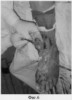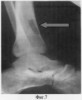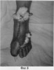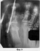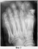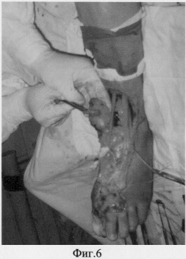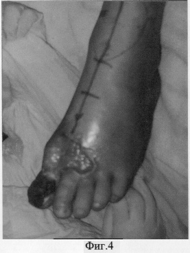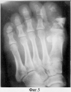 Больная Ю. поступила в клиники ТВМИ (Томск) с диагнозом: Посттравматический остеомиелит основной фаланги 1 пальца правой стопы с обширным некрозом мягких тканей на тыльной ее поверхности (фиг.4, 5).