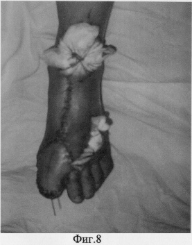 Большеберцовый сосудистый пучок пересечен в проксимальной своей части. Сформированный комплекс тканей на дистальной сосудистой ножке ротирован на 180 градусов и перемещен на передний отдел стопы в зону поражения 1-го пальца.