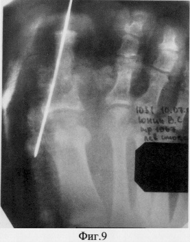После чего кровоснабжаемый костный трансплантат телескопически внедрен в основание основной фаланги первого пальца и фиксирован спицей, а кожно-фасциальный лоскут подшит к краям дефекта покровных тканей по периметру (фиг.8, 9).