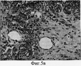 На фиг.5в представлен гистологический срез, сделанный через 2 недели, который демонстрирует васкуляризацию имплантата, то есть появление новообразованных кровеносных сосудов в толще имплантата.