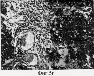 На фиг.5г представлен гистологический срез, сделанный через 3 месяца, на котором внутри новообразованного кровеносного сосуда видны эритроциты, то есть в новообразованных сосудах происходит кровоток.