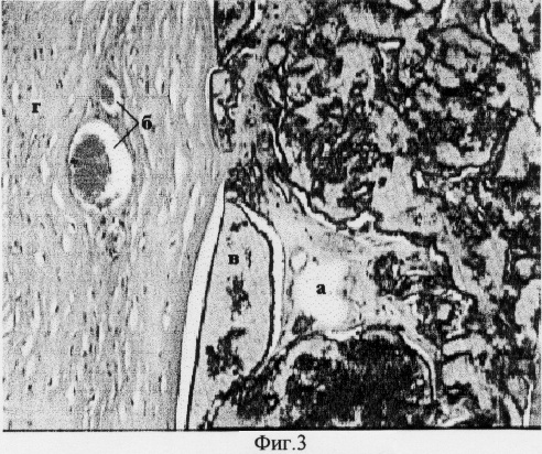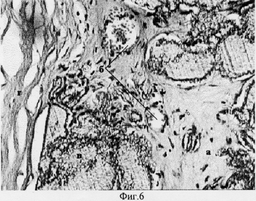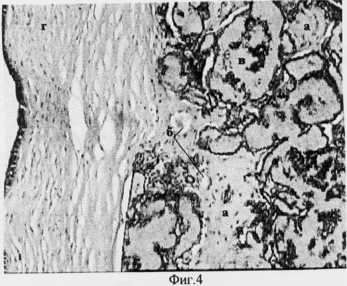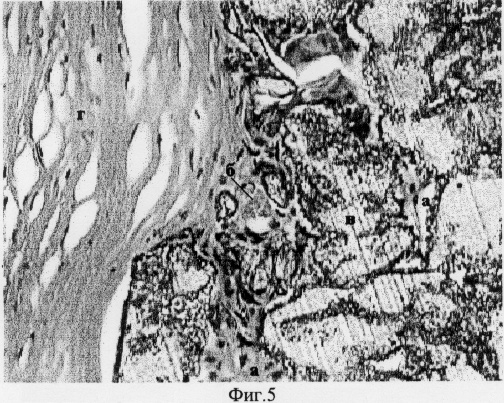 Спустя 4 месяца препараты были взяты на гистологическое исследование путем трепанации всей толщи роговицы. Результаты гистологических исследований представлены на фиг.3-6. Как видно на представленных микрофотографиях поперечных срезов укрепленной роговицы соединительная ткань (а) и единичные кровеносные сосуды (б) врастают в пространство пустот имплантата между элементами полимера (в). Участок роговицы (г) над имплантатом и в других отделах оставался прозрачным, без каких-либо признаков гипоксии и нарушения трофики тканей стромы, Боуменовой оболочки и эпителия. Представленные результаты свидетельствуют об отсутствии барьерной функции заявляемого имплантата для диффузии питательных веществ и кислорода внутри тканей роговицы. Не наблюдалось случаев отторжения имплантата в течение более чем 6 месяцев.