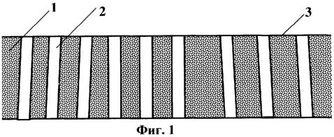 на фиг.1 показано в поперечном разрезе перевязочное средство с цилиндрическими сквозными отверстиями, оси которых расположены под различными углами к поверхности пленки;