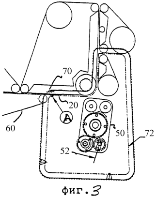 Как показано на фиг.3, в предпочтительном варианте осуществления изобретения используют один или более штифтов 70, которые проходят поперек траектории 72 перемещения штифтов в виде замкнутого контура вокруг средства 50 для складывания прокладок. Длина траектории перемещения штифтов определена таким образом, что в случае наличия только одного штифта он будет проходить всю траекторию перемещения штифта в течение периода времени, соответствующего шагу прокладок 20 при их перемещении по конвейеру. В предпочтительном варианте осуществления изобретения имеются два или более штифта, и длина траектории перемещения штифтов такова, что, когда следующие друг за другом прокладки приближаются к средству складывания прокладок, штифт входит в контакт с крылышками прокладки по существу в одной и той же точке «А» контакта на траектории конвейера. Возможность синхронизировать такую механическую операцию относительно длительности шага хорошо известна из предшествующего уровня техники.