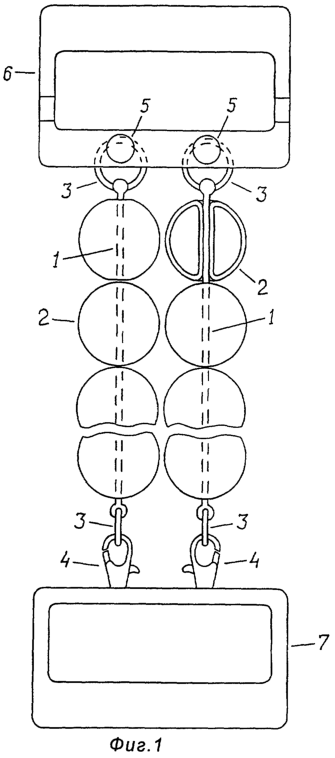 Массажные элементы 2 имеют сквозные центральные отверстия, могут быть выполнены полыми (фиг.1) и одни из них могут быть заполнены каким-либо известным хладагентом, а другие каким-либо известным веществом с высокой теплоемкостью. Массажер может содержать более двух жгутов с массажными элементами. В этом случае жгуты с холодными и горячими массажными элементами располагаются в порядке чередования.