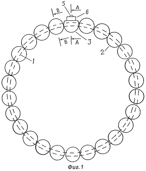 Массажер состоит из обруча 1 (фиг.1-4) и укрепленных на нем съемных массажных элементов 2, заданное расположение которых на обруче зафиксировано с помощью запорного устройства 3. Обруч 1 в поперечном сечении имеет форму квадрата или иной, отличной от окружности фигуры. На ограниченном участке обруча и в его плоскости сделан паз с образованием перешейка 4 для установки на нем запорного устройства 3. На наружной стороне этого перешейка укреплен резьбовой штырь 5 с навинчивающейся на него гайкой 6. Массажный элемент 2 имеет шаровидную форму и в нем сделан срединный фигурный паз 7. Та часть этого паза, которая проходит в осевом направлении через центральную часть массажного элемента, является более широкой, чем периферийный, открывающийся наружу отдел этого паза. Запорное устройство 3 со стороны рабочей зоны массажера имеет форму, близкую к форме массажных элементов. С этой стороны в нем выполнен срединный паз 8 для посадки на перешеек 4. В дне паза сделано отверстие для резьбового штыря 5.