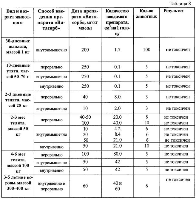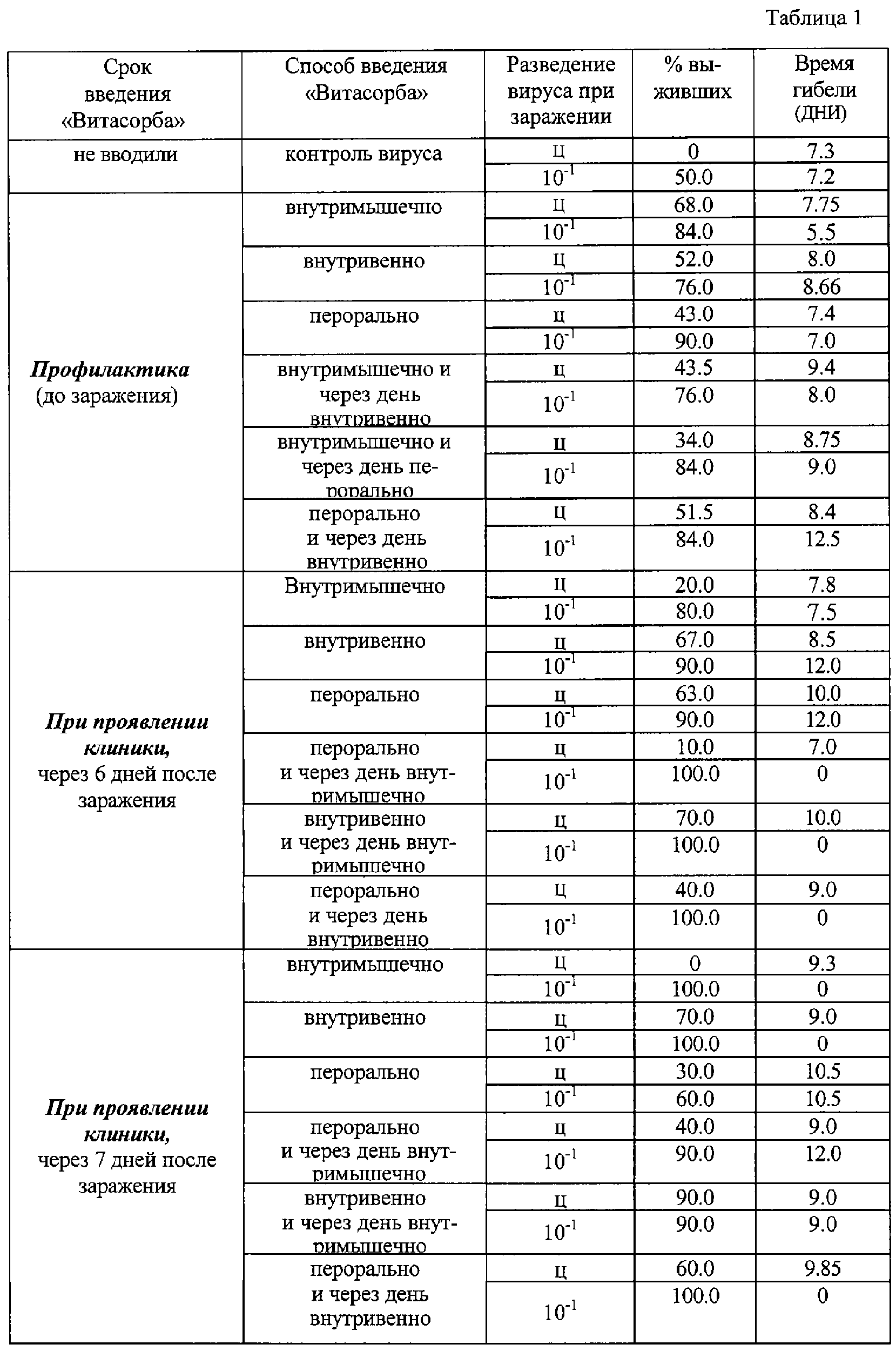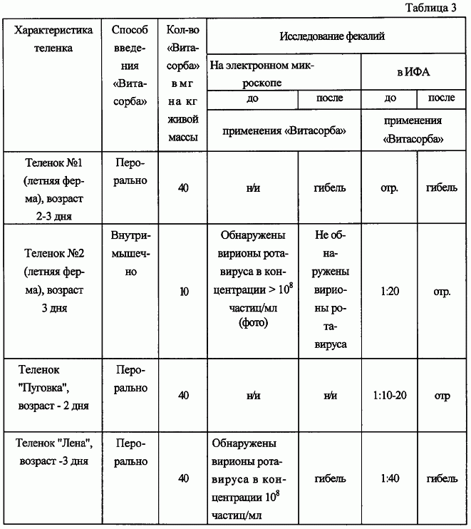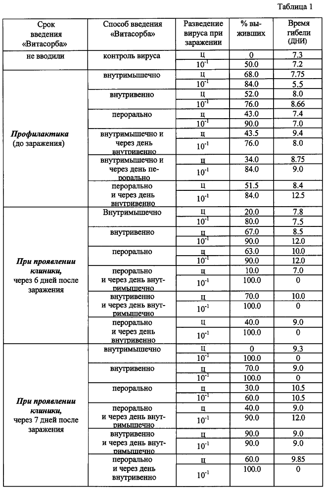 Готовый противовирусный препарат получают путем измельчения сорбента до размера частиц 1×10-5-9×10-3 мкм. Технический результат изобретения заключается в расширении спектра противовирусного действия и повышении эффективности препарата. Механизм противовирусного действия лекарственного препарата “Витасорб” состоит в том, что, являясь высокоэффективным сорбентом, он приводит к подавлению инфекционной активности возбудителей за счет блокирования начальных этапов репликации вирусов в клетках – мишенях, нейтрализует термостабильные и термолабильные токсины белковой природы, имеет высокую скорость адсорбции и с помощью проиннектических свойств обеспечивает быстрое связывание и выведение из организма эндо- и экзотоксинов, а также продуктов неполного распада белков. Препарат может содержать дополнительно в качестве носителя воду и представлять собой суспензию или капсулу, заполненную суспензией. Фармакологические свойства. “Витасорб” не токсичен, не обладает кумулятивными свойствами, не оказывает эмбриотоксического, тератогенного и мутагенного действия. Препарат применяют перорально, внутримышечно и внутривенно в дозах 100-200 мг/кг с лечебной и профилактической целью при вирусных инфекциях животных. “Витасорб”, являясь ионообменным средством, обладает уникальным воздействием на вирусную инфекцию в организме, при своей биодоступности и сверхмалых размерах частиц, средний размер частиц от 1×10-5-9×10-5 мкм, проникает во все органы и ткани организма. Поверхность “Витасорба” легко доступна для сорбирующихся молекул любого размера. Обладает прекрасной гидрофильностью, хорошо смачивается водой, образуя с ней суспензию, обладает высокой сорбционной способностью. При внутривенном применении самая высокая концентрация в крови возникает через 1 час и держится до 72 часов, при пероральном – через 72 часа. У “Витасорба” наблюдаются хорошо сбалансированные осмотические и гидрофильные характеристики, в связи с этим так же проявляется его вирулицидное действие. Выводится через почки, печень и кишечник. Поверхность “Витасорба” легко доступна для сорбирующихся молекул любого размера. Препарат не обладает пирогенной реакцией, не снижает иммунитет, очень эффективен при сочетании способов введения – перорального и внутривенного. Обладает высокой активностью даже на пике вышеприведенных заболеваний в лечебной дозе. “Витасорб” может прекрасно применяться в профилактических целях при целом ряде инфекционных заболеваний. “Витасорб” – уникальный препарат, показан для лечения животных, инфицированных простейшими, обладает противовирусным, антибактериальным эффектом. Может быть использован для профилактики и лечения вирусных инфекций животных: бешенства, болезни Ауески кроликов, ротавирусной инфекции крупного рогатого скота, Ньюкаслской болезни птиц, вирусном гепатите утят, лейкозе и др. Исследования лекарственного препарата “Витасорб” проводились во Всероссийском научно-исследовательском институте защиты животных (ФГУ ВНИИЗЖ) и в Научно-исследовательском институте вирусологии им. Д.И.Ивановского РАМН. Пример 1. Бешенство – остро протекающая болезнь теплокровных животных, характеризующаяся поражением центральной нервной системы. Восприимчивы к ней домашние и дикие животные всех видов, а также человек. Беш