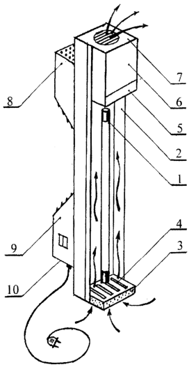 Схема установки и принцип действия представлены на чертеже. Озонообразующая бактерицидная лампа (1) установлена в защитном корпусе (2). Через светозащитные жалюзи (3) и антипылевой фильтр (4) воздух протягивается вдоль лампы (1) через противоозонный каталитический фильтр (5) с помощью вентилятора, расположенного внутри короба (6). Струя обеззараженного воздуха с малым содержанием озона выходит через направляющие жалюзи (7). Блок питания лампы и управления работой устройства (8) и блок питания вентилятора (9) могут быть смонтированы в отдельных корпусах, как на чертеже, или в одном корпусе. Рядом с сетевым проводом может располагаться держатель предохранителя (10).