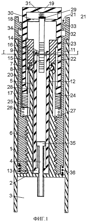 Поворот задающей дозу кнопки 18 и чашеобразного элемента также передается на редуктор 9 посредством выступов 23 на этом редукторе, зацепляя продольные углубления 22 во внутренней стенке трубчатой части 20 указанного чашеобразного элемента. Поворот редуктора 25 через соединительные стержни 12 передается на гайку 13, которая таким образом винтовым движением перемещается вверх по резьбе штока 4 поршня и поднимается от своего примыкания к перегородке 2, когда задают дозу. Поскольку дозу задают перемещением гайки 13 на самом штоке поршня, который приводит в действие поршень в ампуле (не показана) в отсеке 3, ограничитель задания дозы, который не дает величине заданной дозы превысить количество оставшегося в ампуле лекарственного средства, можно удобным образом создать за счет обеспечения штока 4 поршня стопором 35, который ограничивает перемещение гайки 13 вверх по штоку 4 поршня.