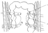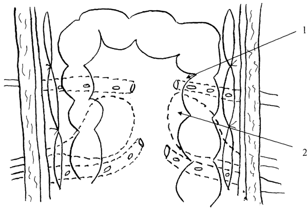 Затем рассечена париетальная брюшина вдоль восходящей ободочной кишки, отступив от нее вправо на 2 см. Восходящая ободочная кишка смещена влево. Удалена ферментативно пораженная клетчатка правой половины забрюшинного пространства. На место удаленной клетчатки введен тампон, смоченный перекисью водорода. Удален тампон из левой половины забрюшинного пространства, введены резиновый баллон и два перчаточно-трубчатых дренажа с выведением их через контрапертуры в поясничной области. Париетальная брюшина ушита над дренажами узловыми швами. Аналогичное дренирование выполнено правой половины забрюшинного пространства. Произведено дренирование сальниковой сумки, в полость сумки вшита капсула для контрольно-динамической панкреатоскопии. Брюшная полость дренирована перчаточно-трубчатыми дренажами из четырех точек. Ушивание брюшной полости.