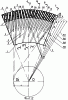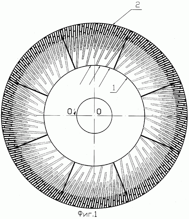 На фиг.1 изображена фронтальная проекция размалывающей гарнитуры дисковой мельницы в сборе. (Ближайшая к центру дисков окружность, изображенная тонкой линией, является кромкой входного отверстия несущего статорного диска. Кольцевая полость, расположенная между входной окружной кромкой отверстия несущего статорного диска и закрепленных на нем и роторном несущем диске секторов, является разгонной зоной, тонкими линиями нанесены касательные к окружности входного отверстия несущего статорного диска, по которым размещены все ножи.)