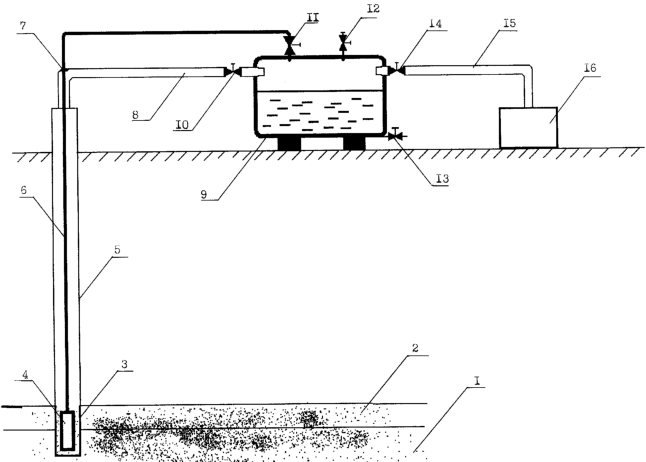 В качестве примера реализации способа на чертеже представлено устройство, где изображены: водный горизонт 1, грунт 2, пропитанный нефтепродуктом, фильтр 3, надетый на нижний конец скважины, погружной насос 4, размещенный в скважине 5 и соединенный откачивающей магистралью 6 через вентиль 11 с гравитационным сепаратором 9, который через вентиль 10 и вакуумную магистраль 8 соединен со скважиной 5, эластичная муфта 7, обеспечивающая герметизацию отверстия, через которое проходит откачивающая магистраль 6, вентиль 12, вмонтированный в гравитационный сепаратор 9 и предназначенный для выравнивания давления при сливе содержимого через вентиль 13, вакуумный узел 16 через вакуумную магистраль 15 и вентиль 14 подсоединяется к гравитационному сепаратору 9.