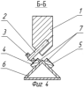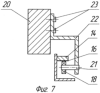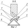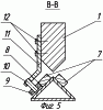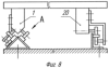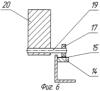 Данная направляющая представлена на фиг.6 и 7. Две параллельные и горизонтально расположенные грани рейки служат плоскостями качения для роликов каретки. Рейка направляющей содержит в своем составе только один брусок 14, имеющий форму параллелепипеда. Брусок в сечении имеет форму прямоугольника (секущая плоскость перпендикулярна оси рейки). Брусок размещен в горизонтальной плоскости так, что нижняя и верхняя грани параллелепипеда расположены в горизонтальных плоскостях, а боковые грани в вертикальных плоскостях. Верхняя 15 и нижняя 16 грани бруска служат плоскостями качения для роликов каретки. По верхней грани 15 катается ролик 17, а по нижней грани 16 ролик 18. Ролик 17 посредством оси 19 устанавливается непосредственно на каретке 20, а ролик 18 посредством оси 21 крепится к уголку 22. Уголок 22 присоединяется к каретке 20 посредством разъемного соединения 23. Соединение 23 позволяет осуществлять выборку люфтов, появляющихся от укатывания роликов 17 и 18 в процессе длительной работы устройства, с помощью крепежных болтов с эксцентриситетом. Разъемное соединение 23 позволяет при необходимости осуществлять быстрый съем каретки с рейки (например, при ремонте) путем освобождения болтов.