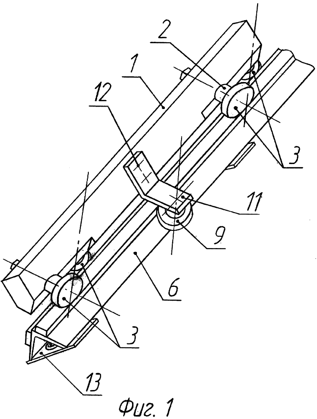 Данная направляющая качения представлена на фиг.1 – 5. Она содержит каретку 1, на которой посредством осей 2 установлены опоры качения 3. Оси 2 расположены под углом друг к другу. В рассматриваемом варианте угол составляет 90 градусов. Внешние цилиндрические поверхности опор качения 3 катаются по плоскостям качения 4 и 5 рейки. Рейка направляющей качения состоит из отдельных деталей, собранных в единый элемент: основания 6 и двух закрепленных на боковых гранях основания 6 брусков 7, имеющих форму параллелепипеда. Брусок в сечении имеет форму прямоугольника (секущая плоскость перпендикулярна оси рейки). Угол между плоскостями качения 4 и 5 рейки, которые образуют верхние поверхности брусков, равен углу между осями 2 рейки и в данном случае составляет 90 градусов. Боковая поверхность 8 одного из брусков 7 рейки служит плоскостью качения для ролика 9, который посредством оси 10 установлен на уголке 11. Уголок 11 посредством разъемного соединения 12 крепится к каретке 1. Соединение 12 позволяет осуществлять выборку люфтов, появляющихся от укатывания роликов 3 и ролика 9 в процессе длительной работы устройства, с помощью крепежных болтов с эксцентриситетом. Разъемное соединение 12 позволяет при необходимости осуществлять быстрый съем каретки с рейки (например, при ремонте) путем освобождения болтов. Рейка имеет площадки крепления 13 для установки на станке. Площадки крепления 13 имеют крепежные болты с эксцентриситетом. Углы между плоскостями качения рейки выбираются такими, чтобы ролики охватывали рейку с трех сторон и препятствовали смещению каретки в любом направлении, отличном от направления ее перемещения.