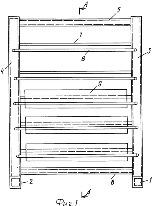 Стеллаж для хранения красочных ящиков содержит балки-опоры 1 и 2, на которые установлена рама, содержащая стойки 3 и 4, основания – верхнее 5 и нижнее 6, параллельные друг другу полки, образованные двумя рядами стержней 7 – ряд I и стержней 8 – ряд II (фиг.2).