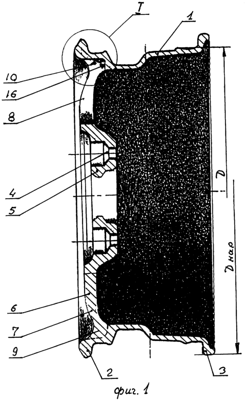 Задняя поверхность 15 реборды 2 выполнена в виде участков поверхностей выпуклого тороида 19 с радиусом R4 и вогнутого тороида 20, касательных одного другому. Поверхность тороида 20 касательна к конусному участку 21, определяемому углом °, ограничивающему поверхность прилегающей к реборде 2 части обода 1. Поверхность выпуклого тороида 22 с радиусом образующей R5 формирует хамп 23 с наружным диаметром D.