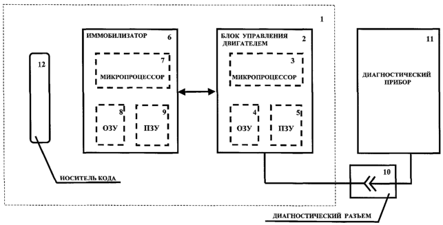 Способ может быть реализован в системе 1 безопасности автомобиля (см. чертеж), включающей в себя подключенные к информационной шине автомобиля блок 2 управления двигателем, снабженный микропроцессором 3, ОЗУ 4 и ПЗУ 5, и иммобилизатор 6, снабженный микропроцессором 7, ОЗУ 8 и ПЗУ 9. К информационной шине автомобиля через диагностический разъем 10 подключают также диагностический прибор 11. В частном случае реализации диагностическим разъемом 10 может быть снабжен блок 2 управления двигателем. В состав системы безопасности может входить носитель кода 12 (транспондер, карточка, инфракрасный передатчик).