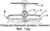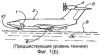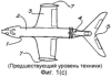 Конструкцией летательного аппарата на воздушной подушке, в которой достигнут наивысший уровень технического совершенства, является российский экраноплан. Он также описан в отчете Управления. Типичный пример конфигурации экраноплана реализован в “Русском Орленке”, показанном на фигурах 1(а)-1(с). В этом летательном аппарате на воздушной подушке из уровня техники турбовентиляторные двигатели 1 расположены на каждой стороне фюзеляжа 2. Эти двигатели 1 используются для получения скоростного напора повышенной мощности путем нагнетания под крыло для повышения подъемной силы крыла 3 во время взлета и посадки, в результате чего снижаются взлетная и посадочная скорости. Турбовинтовой двигатель 4 создает эффективную тягу для крейсерского полета. Горизонтальным стабилизатором 5 регулируют момент тангажа. Водные лыжи 6 (показаны в выпущенном положении) могут быть выпущены для уменьшения ударных нагрузок на корпус при посадке. Концевые шайбы 7 способствуют поддержанию давления под крылом для обеспечения увеличенной подъемной силы, создаваемой за счет скоростного напора повышенной мощности во время взлета и посадки. Поскольку концевые шайбы 7 не вытянуты ниже самой нижней части фюзеляжа 2, эффективный воздушный промежуток 8 между концевыми шайбами 7 и поверхностью 9 воды не меньше промежутка 10 между самой нижней частью фюзеляжа 2 и поверхностью 9 воды. Поэтому способность концевых шайб 7 к снижению индуктивного сопротивления является ограниченной.