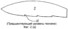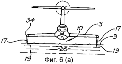 На фигурах 2(а) и 2(b) показаны виды сбоку и сверху толстых концевых шайб 7 летательного аппарата на воздушной подушке “Орленок” из уровня техники. На взлете и посадке эти концевые шайбы 7 рассчитаны на глиссирование по поверхности 9 воды в то время, когда фюзеляж 2 все еще поддерживается поверхностью 9 воды. Уступы 12 на нижней поверхности концевых шайб способствуют этому глиссированию. Для уменьшения аэродинамического сопротивления стороны 13 выполнены обтекаемыми.