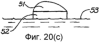 В другом варианте осуществления настоящего изобретения летательный аппарат на воздушной подушке выполнен таким образом, что фюзеляж и конструкция крыла образуют аэродинамическую схему “летающее крыло” без отдельного различимого фюзеляжа. Этот вариант осуществления, показанный на фигурах 20(а)-20(с), теоретически является более эффективным в случае более крупных летательных аппаратов на воздушной подушке по сравнению с конструкцией гидросамолета, показанной на фигурах 6(а)-6(с). Концевые шайбы 52 имеют те же самые конструктивные особенности, что и концевые шайбы 17, использованные в конструкции гидросамолета, и они тем же самым способом исключают промежуток между крылом 51 и водой 53.