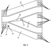 Стрелка рельсового пути для рельсово-безрельсового транспортного устройства (фиг.6) представляет собой равнобедренное треугольное соединение металлических направляющих рельсов для рельсово-безрельсового транспортного устройства с комбинированной энергоустановкой, оснащенного переводным металлическим рельсом 9, имеющим стреловидную форму.