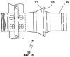 На фиг.8 и 9 представлен пример выполнения стандартизованного стыковочного устройства, соответствующего одному из вариантов изобретения. Видно, что стыковочное устройство 12 предпочтительно снабжено собственным уплотнением 16. При этом каждая стыковочная зона, предназначенная для размещения соответствующего разъема, дополнительно окружена отдельным уплотнением 16а. С данным стыковочным устройством могут применяться штыревые соединители 18, например в варианте, более подробно описанном далее со ссылкой на фиг.15 и 16, т.е. снабженные собственным влагонепроницаемым уплотнением 17. Благодаря описанному выполнению собственные ответные штыревые соединители на двигательном модуле 1 (не изображены) могут быть введены внутрь штыревых соединителей 18 в ходе единственной операции, обеспечивающей надежные подсоединения, которые необходимы для осуществления питания, функционирования и управления.
