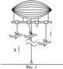 3. Устройство для осуществления взлета и посадки ЛА, содержащее воздушную гавань, выполненную в виде наполненной летучим газом оболочки, прикрепленную к гавани со стороны земли направляющую, расположенные на направляющей приводы с тросами, на концах которых крепятся захватные устройства для ЛА, отличающееся тем, что в нем направляющая выполнена с замкнутым контуром и имеет внутренние разветвления, осуществленные при помощи стрелок, а указанные приводы выполнены подвижными относительно направляющей.