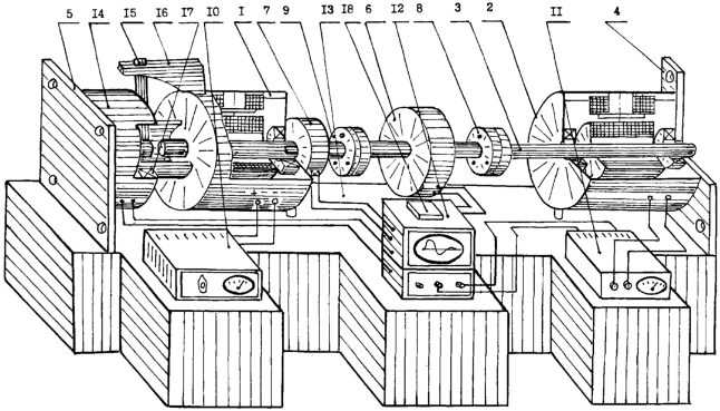 Составные части вала 3 соответственно закрепляются на подшипниках привода 1, нагружателя 2 и кинематически соединяются между собой фланцами или муфтой (на чертеже муфта не показана). В результате образуется механическая система, позволяющая передавать внешнее нагружение, моделируемое с помощью нагружателя 2 и регулируемого источника питания 11, на выход привода 1. Внешнее нагружение характеризуется крутящим моментом.